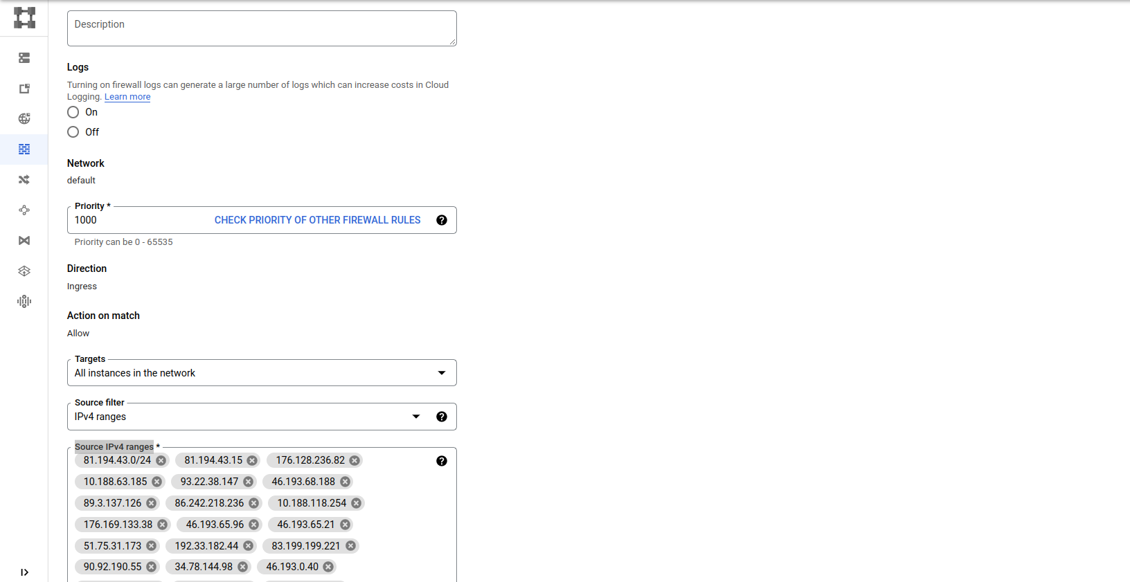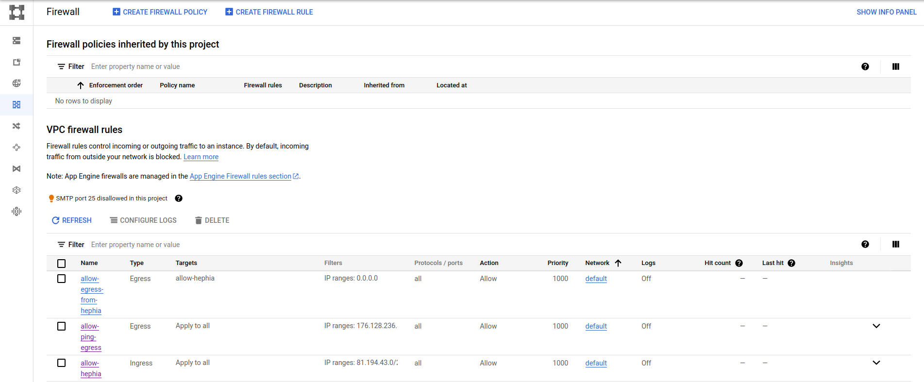 Register an IP address means adding it in the IP range of the ==VPC Network firewall== rule called allow-hephia. You can access this through this link. You’ll have this screen, then you click on ==allow-hephia==.